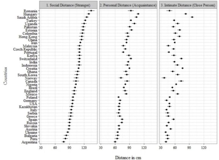 Personal space is perceived differently in different cultures. A huge study with almost 9,000 participants from 42 countries found that the distance usually kept in various social situations varies tremendously between countries.