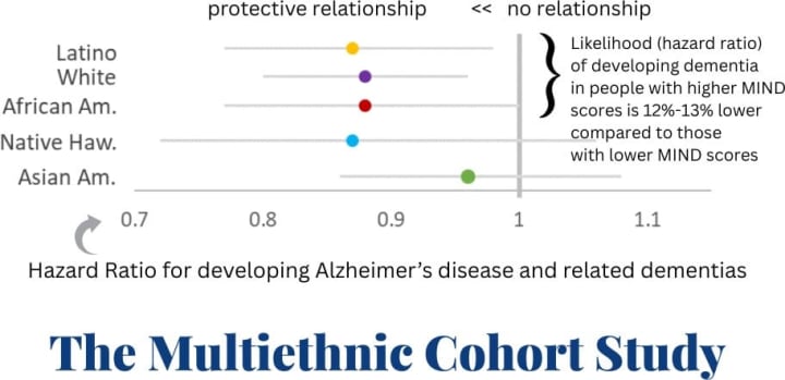 Overall, participants who scored higher for MIND adherence at baseline had a 9% lower risk of dementia, with an even greater reduction—around 13%—among those who identified as African American, Latino, or White. Baseline MIND diet adherence was not associated with a significant risk reduction among Native Hawaiian or Asian American participants.