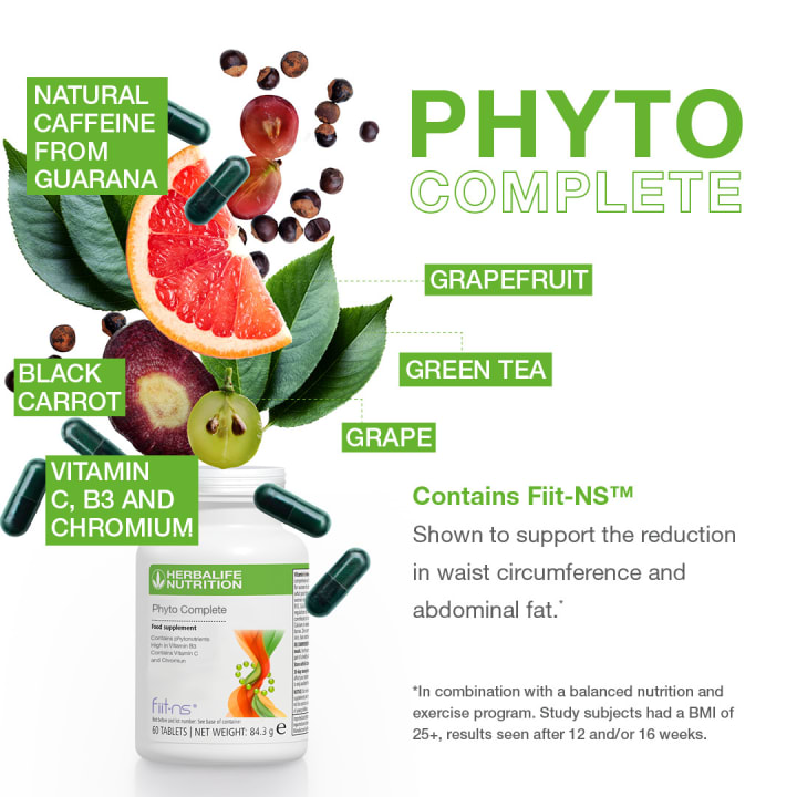 Phyto Complete by Herbalife Nutrition is a scientifically-formulated supplement that contains natural ingredients such as Grapefruit, Black Carrot, Caffeine from Guarana, Green Tea, Vitamin C, B3, and Chromium. The one-of-a-kind blend also contains Fiit-NS, which has been shown to support the reduction in waist circumference and abdominal fat.