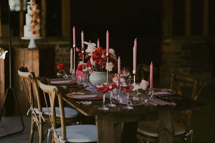 We chose this beautiful summer palette of coral and peach to complement the warm tones of the brick interiors, while maintaining the softness of an elegant modern wedding. The decorators came in with similar tones, in coral and pink, for a really romantic, bold look. Accents of copper from the candlesticks and the plates brought in the warmer tones of the cake, while the wooden chairs kept the barn feel cosy and comfortable.