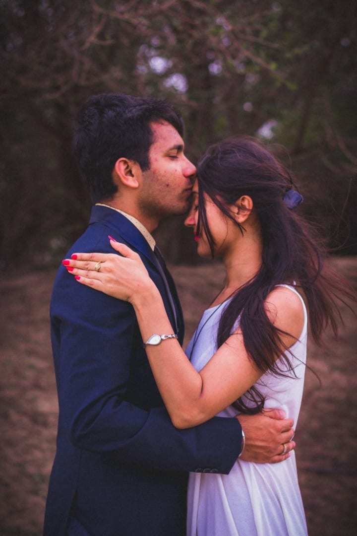 A gentle kiss on the forehead is a timeless gesture of love, care, and affection. It conveys deep emotions and tenderness, making it a must-have kiss poses in your pre-wedding photoshoot.
