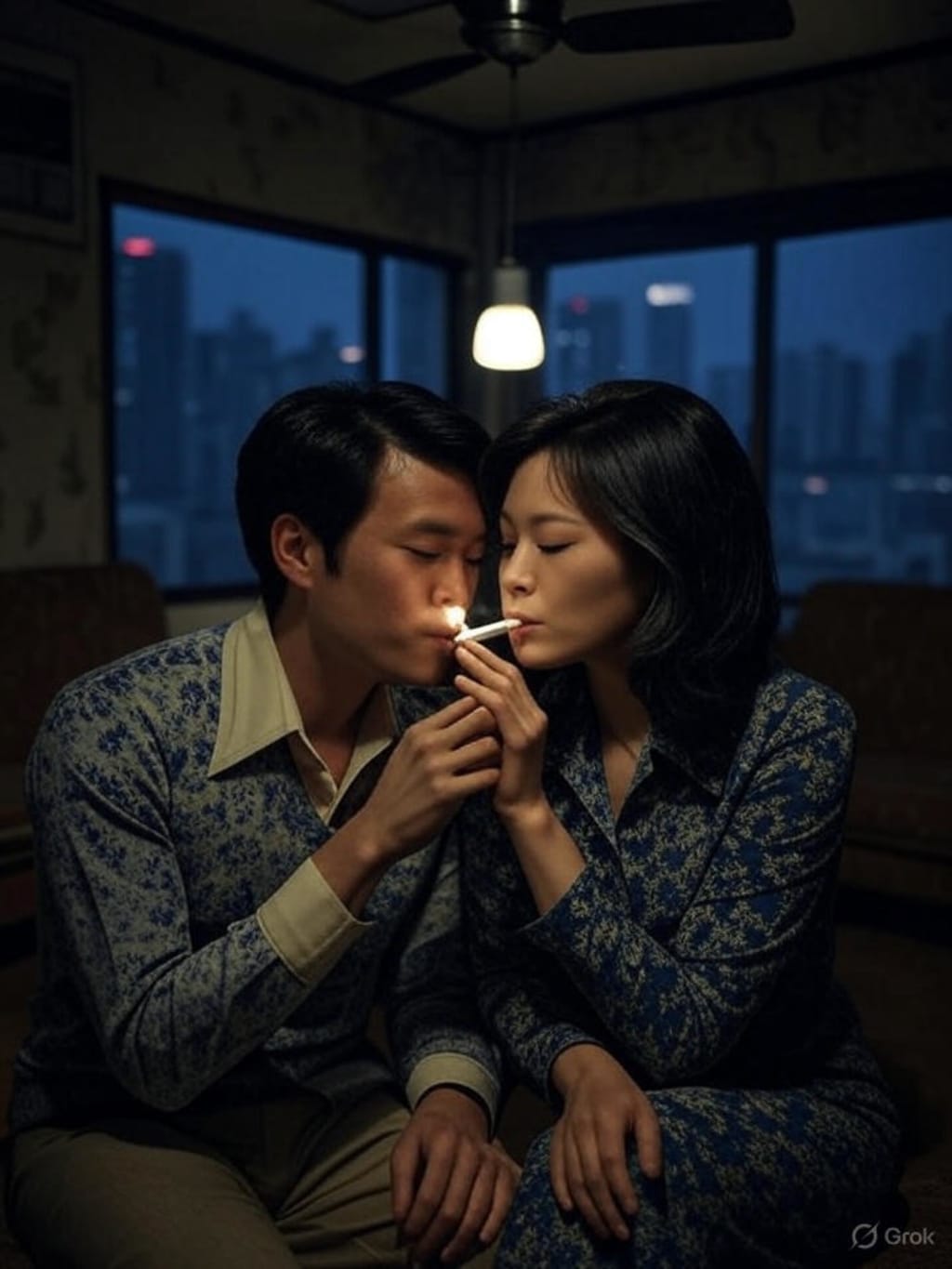 She looks back at her glass, tilts it to catch the last of the melted ice, and drinks it down in one small motion. Then she moves toward you, wordless. She takes the cigarette from your fingers, inhales deeply, the ember glowing faintly in the dim light, and as she exhales, she leans in, pressing a quick kiss against your lips. A touch that is both familiar and final.