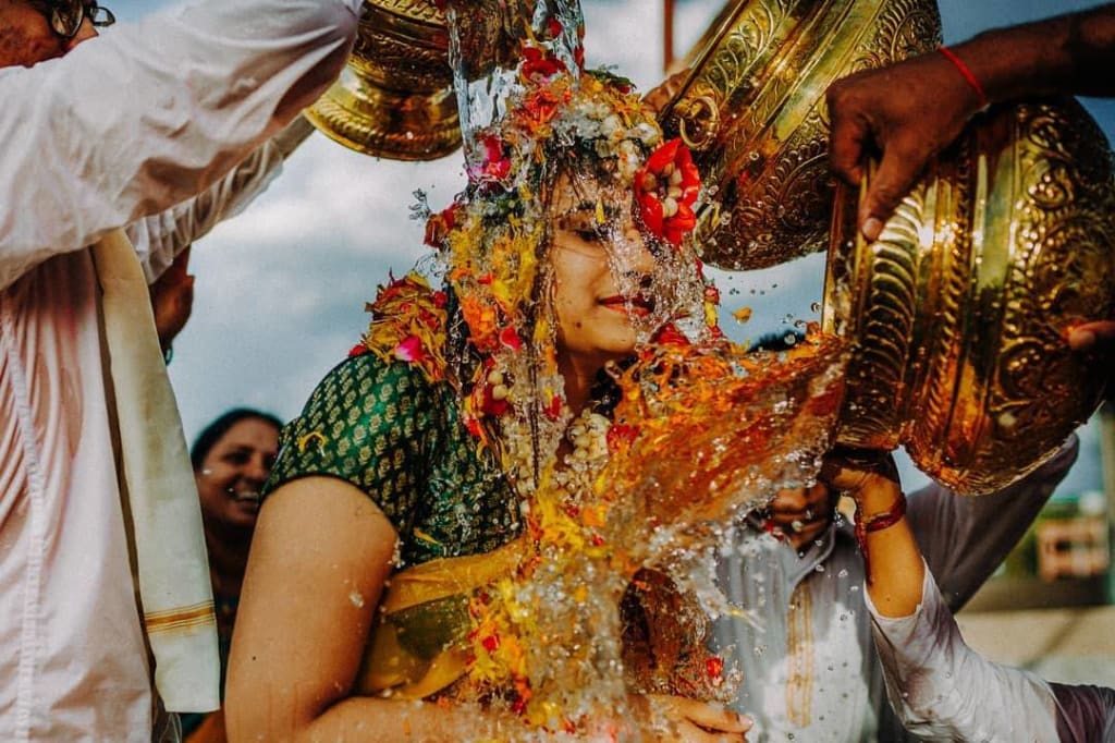 Mangala Snanam is referred to the purification bath. Bride and groom take bath before they go on ahead with the rituals of the wedding. Before Mangala Snanam, Kumkum, Haldi, and oil are applied on the skin of the groom and the bride.