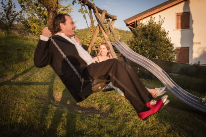 Our wedding was also full of play and light moments. Here, Brendan and I are pictured on the swing set outside the Agriturismo. Brendan changed outfits for the evening dinner reception, and I changed shoes.