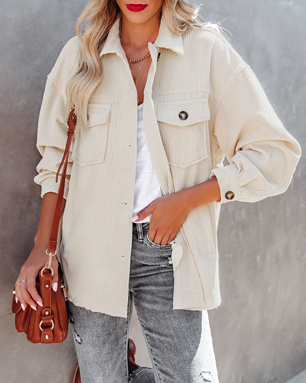 Beaully Women's Corduroy Button Down Shirts Casual Long Sleeve Oversized Jacket Shacket Coat with Pockets