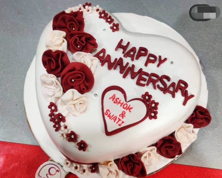 If you want simply a good designer cake, a wedding anniversary cake in heart shape with fondant flowers on top is a decent cake option for your special day. You can try more color combinations like White-red, White-Pink, White-Blue, or more options depending on your party theme.