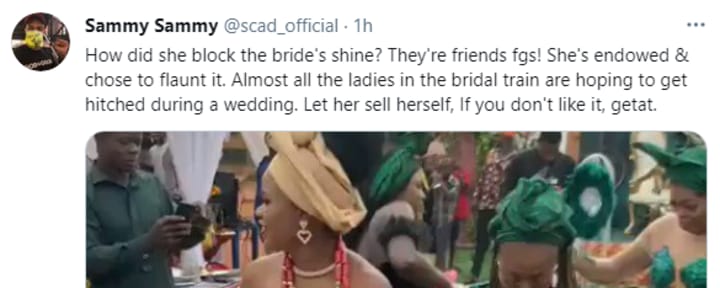 How did she block the bride's shine? They're friends fgs! She's endowed & chose to flaunt it. Almost all the ladies in the bridal train are hoping to get hitched during a wedding. Let her sell herself, If you don't like it, getat.