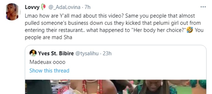 Lmao how are Y'all mad about this video? Same you people that almost pulled someone's business down cus they kicked that pelumi girl out from entering their restaurant.. what happened to "Her body her choice?" You people are mad Sha