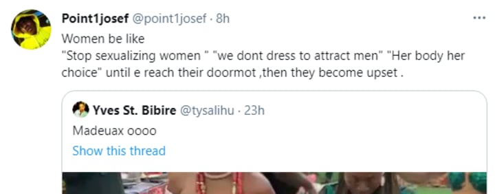 "Stop sexualizing women " "we dont dress to attract men" "Her body her choice" until e reach their doormot ,then they become upset .