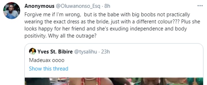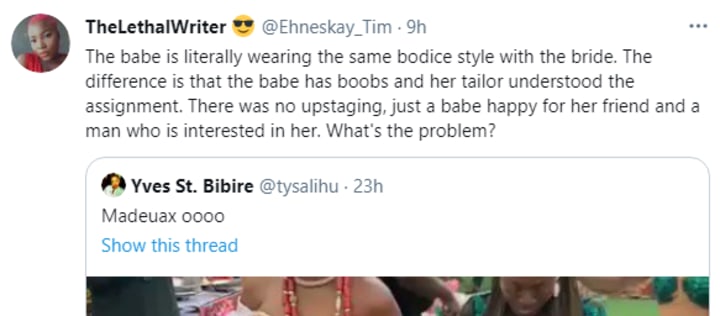 The babe is literally wearing the same bodice style with the bride. The difference is that the babe has boobs and her tailor understood the assignment. There was no upstaging, just a babe happy for her friend and a man who is interested in her. What's the problem?