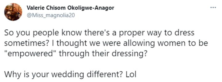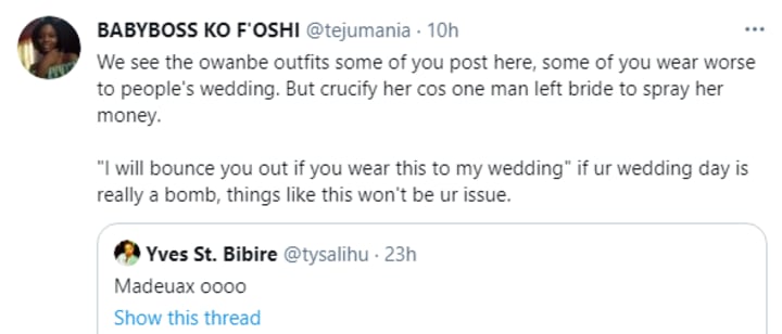 We see the owanbe outfits some of you post here, some of you wear worse to people's wedding. But crucify her cos one man left bride to spray her money.