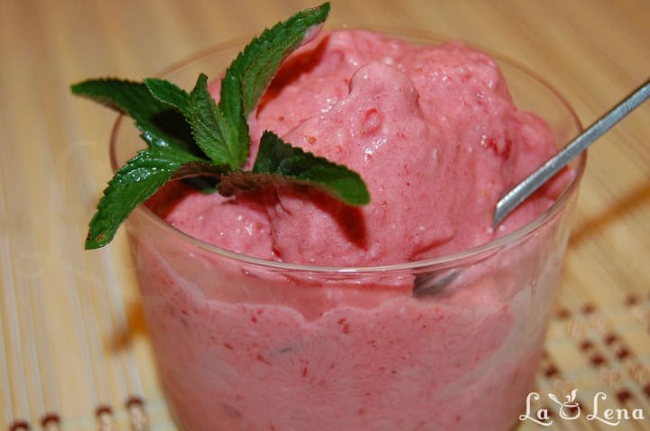 - We insert the pieces of strawberry ice cream into the robot and mix at maximum speed until we get a foamy ice cream without ice crystals in it.