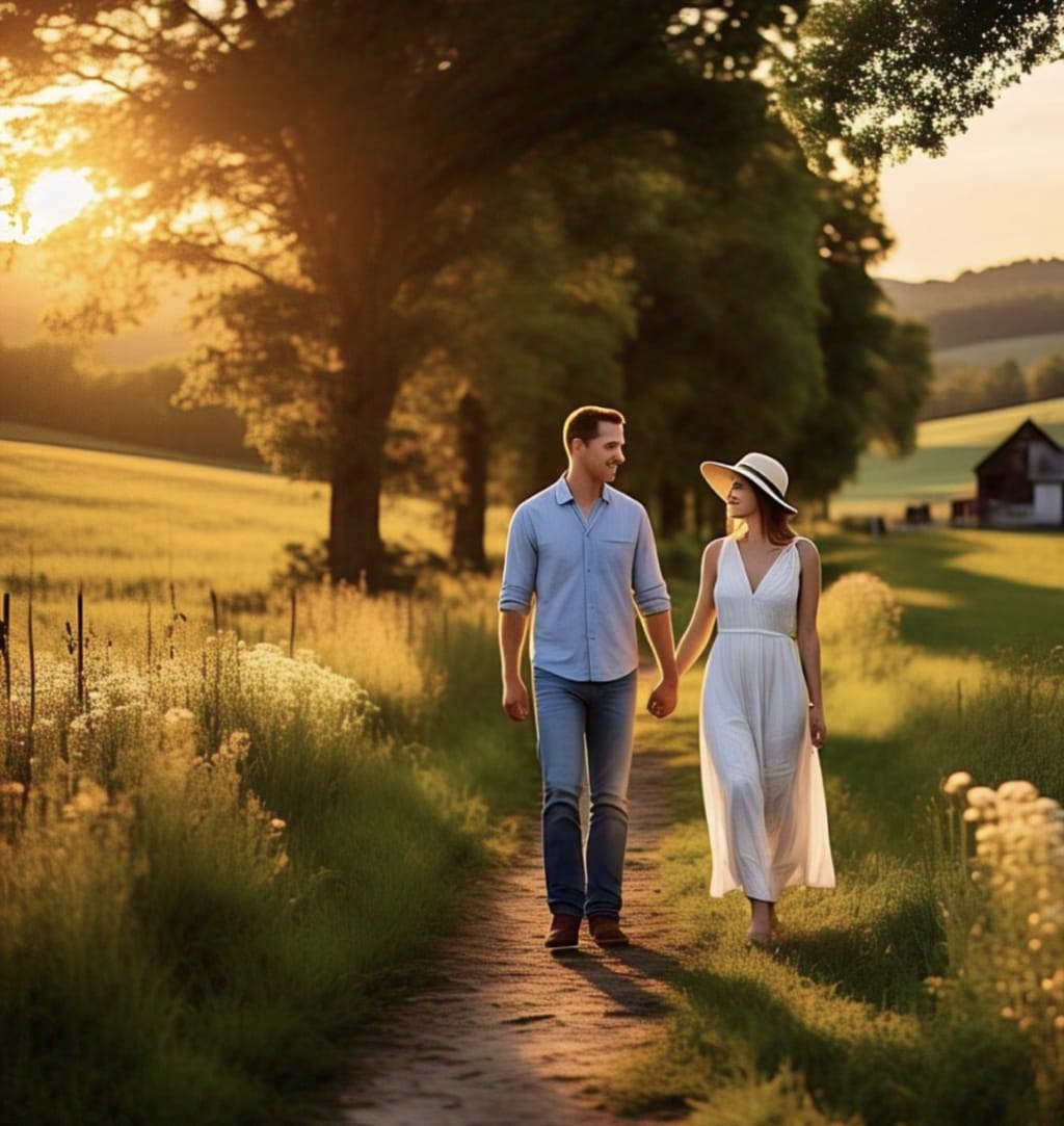 As the sun set over the rolling hills, Emily and Jack found themselves lost in the serenity of the moment. They had met by chance at a quaint bookstore, bonding over their shared love of literature. Now, as they strolled hand in hand, the warm breeze carried the sweet scent of blooming flowers, and their hearts beat as one.
