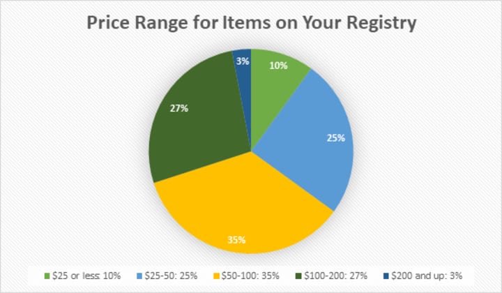 - This breakdown shows how many items you should have in various price points. Keep a close eye on is the range between $25-100. That is the typical price point for most registry gifts for showers and weddings and are the categories that are the hardest to fill. Don’t sweat over finding things under $25, that category is usually the easiest to fill.