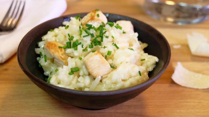 Risotto is a northern Italian rice dish cooked with broth until it reaches a creamy consistency. The broth can be derived from meat, fish, or vegetables. Many types of risotto contain butter, onion, white wine, and Parmigiano-Reggiano. It is one of the most common ways of cooking rice in Italy. Saffron was originally used for flavor and its signature yellow color.