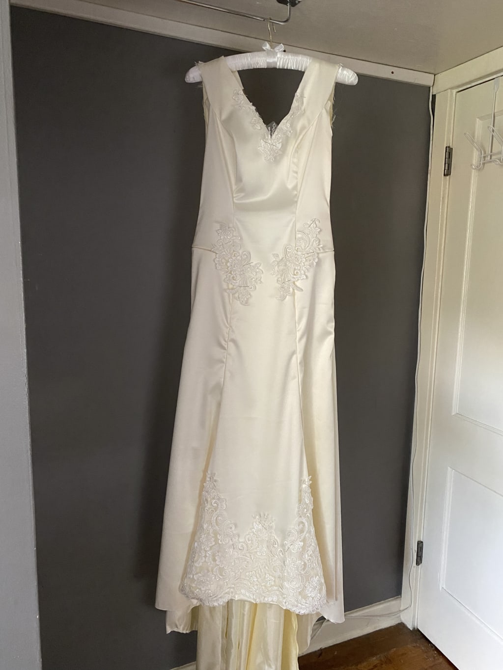 Within weeks I had a pattern I liked with some edits of my own. Not long after, the perfect fabric. The outside would be ivory satin with a silk lining on the inside, beautiful neckline, and my favorite detail, an illusion open back adorned with heavy beaded lace and satin buttons running up the spine to hide an invisible zipper. However, before I got down to making the dress, I needed to make a mockup of the design. I found a cheap cotton fabric that was easy and quick to cut and made the size adjustments necessary for what I estimated would be my final dress’ measurements. The result was a perfectly fitting mock wedding dress that had me cheering for myself and daydreaming about the big day. Sadly, the one who had always cheered me on with all my projects wouldn’t be able to see the progress I would be making, though magically despite living together he had avoided catching any glimpse of the dress or fabrics or adornments. Thankfully, I could show my mom and sister the progress as well as my future mother in law! As I sharpened my scissors and roller, spread out my cutting mat, and plugged in my machine, I realized I would be needing the encouragement. I had never worked with satin or silk or embroidery, and each one has particular needs or dangers. By all indications, the different textures and weights were going to make it difficult to sew together and not have it look baggy or scrunched up. This in fact happened to all the sections for the long skirt, leading to hand-stitching the border to get the two fabrics perfectly flat before sewing them on the machine. And even then, mistakes can happen, like when I sewed a section of the skirt in reverse, the sides sewn to the tops, leading to an “oh no..oh nO...OH NONONONONO!” that my fiance heard from upstairs where he was hiding out for a few hours. The sleeves in ilusion fabric were a pain in the neck too, going through a design change that wasn’t then relayed to my hands, which then proceeded to cut out the wrong design, not once, not twice, but three times!