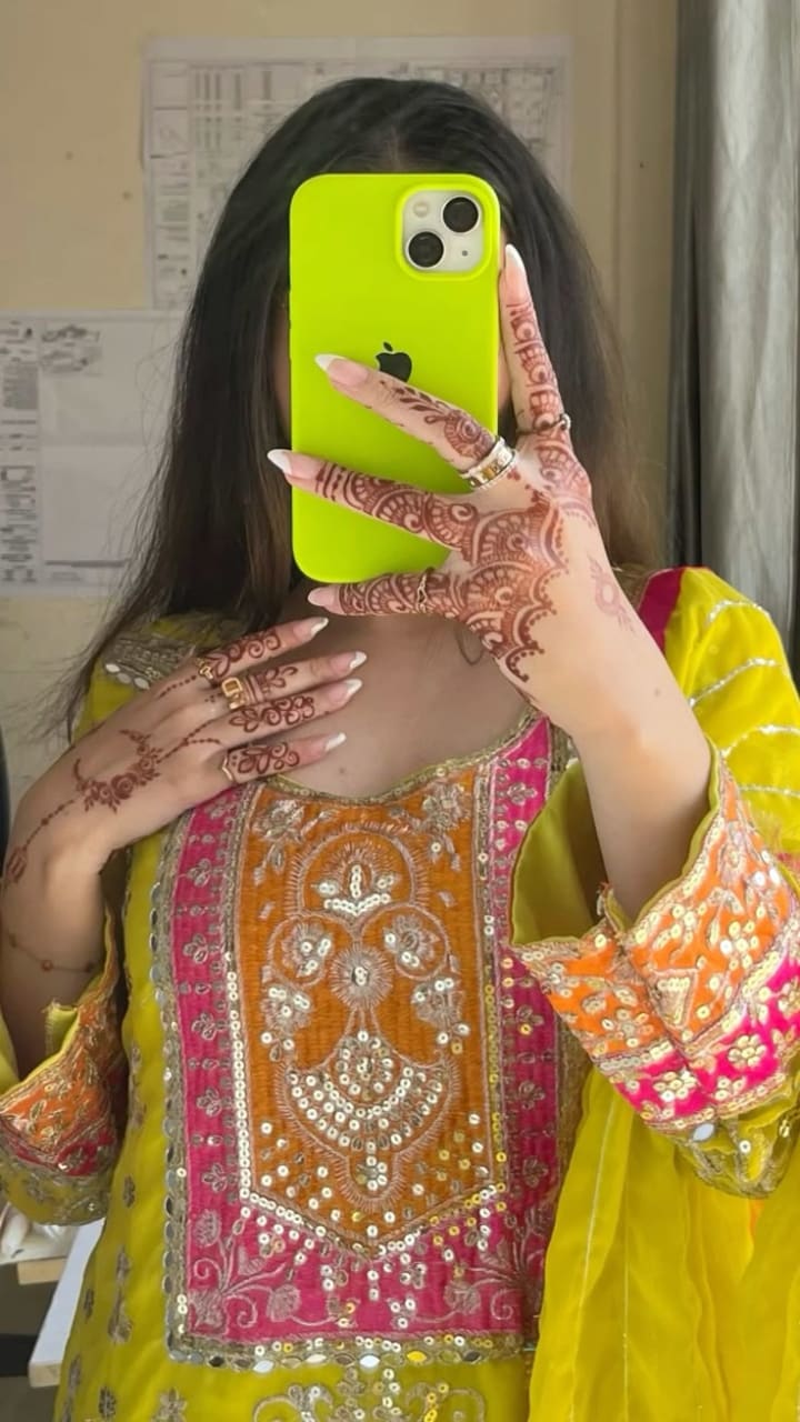 Wear Contrasting Colors – Colors like white, gold, or bright hues help highlight the deep brown of the mehndi.