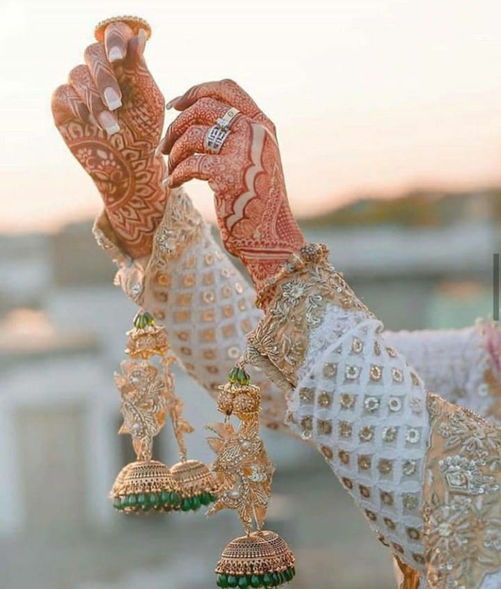 Pairing bridal jewelry with mehndi-adorned hands adds a majestic and luxurious touch to bridal photos. Stacking bangles, rings, or hathphool enhances the aesthetic of these mehndi poses girl ideas.