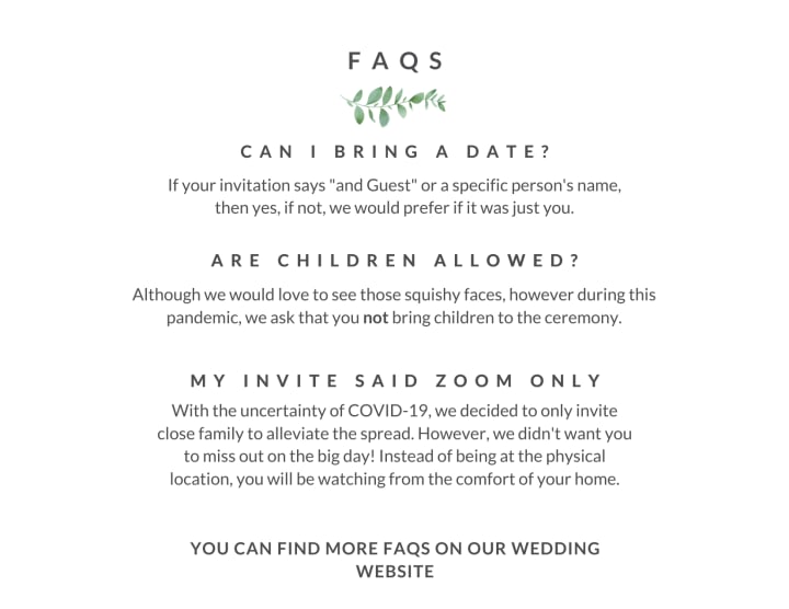 I used Zola for my wedding website and used that as a place for everyone to RSVP. The fun part about Zola is that it got with the times and allowed us to connect ZOOM to our site so people invited virtually could watch!