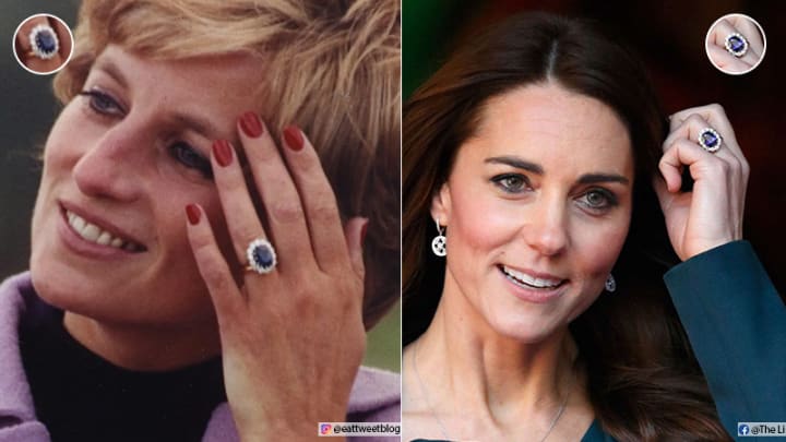 The most relevant instance could be that of the iconic Princess Diana blue sapphire ring. Featuring a massive 12ct, oval-cut blue Ceylon sapphire centerstone, this ring is the most distinguished celebrity engagement ring of all time. After Princess Diana died, her elder daughter-in-law, Kate Middleton, is the new heiress of the ring.