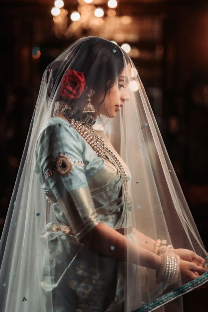 The South Indian bride looks nothing less than a goddess, adorned in a magnificent Kanjeevaram silk saree in shades of red, gold, green, or maroon. The saree is often handwoven with intricate gold zari work symbolizing prosperity and elegance.