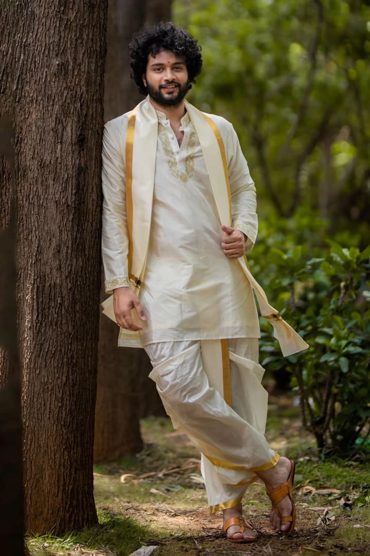 White Silk Veshti (Dhoti) – A silk dhoti with a gold border, symbolizing auspiciousness and tradition.