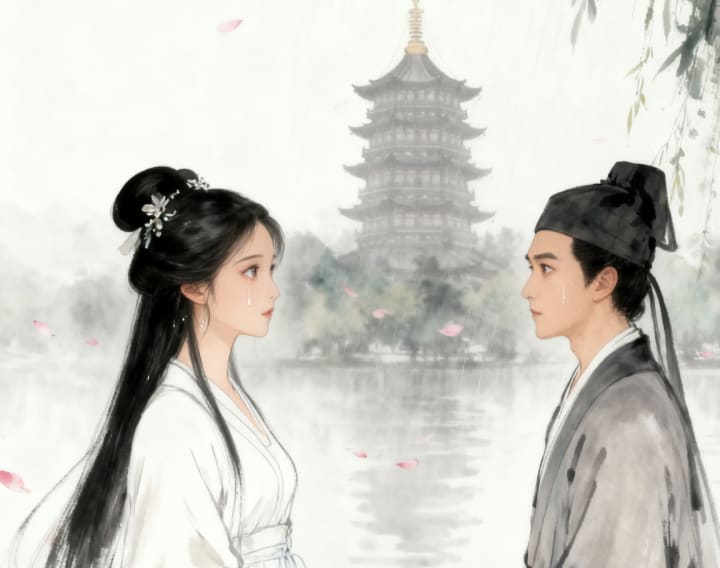 Xu Xian was torn between fear and love. He loved her deeply, but the image of the serpent haunted him. Fahai urged him to flee, but Xu Xian could not bring himself to abandon her. Instead, he sought answers—visiting temples, consulting sages, and studying ancient texts. He learned that Bai Suzhen had never harmed anyone; in fact, she had saved countless lives with her healing.Meanwhile, Fahai grew more determined. He believed that even a benevolent spirit was a danger to the natural order. He captured Bai Suzhen during a moonless night, trapping her beneath a golden alms bowl and imprisoning her beneath the Leifeng Pagoda on the shore of West Lake.Xiao Qing, furious and heartbroken, swore revenge. She trained for years in the art of sword fighting and magic, studying under a reclusive immortal in the southern mountains. When she returned, she challenged Fahai in a battle that shook the heavens. Lightning split the sky, and the lake boiled as they dueled atop the pagoda. Though Xiao Qing was powerful, Fahai’s spiritual power was immense. In the end, she was forced to retreat, vowing to return.Years passed. Xu Xian, now a man with silver in his hair, never remarried. He visited the Leifeng Pagoda every day, leaving lotuses and incense, whispering words of love to the spirit trapped beneath. He wrote poems about her, and the people of Hangzhou began to see her not as a demon, but as a tragic heroine.One spring morning, as cherry blossoms fell like rain, a miracle occurred. The Leifeng Pagoda began to glow with a soft, white light. The golden bowl cracked, and from beneath it emerged Bai Suzhen, radiant and whole. The power of Xu Xian’s unwavering love, combined with her own centuries of virtue and compassion, had broken the spell.Fahai, now an old man, witnessed the event in silence. He bowed his head. "Perhaps," he murmured, "love is a greater magic than I understood."