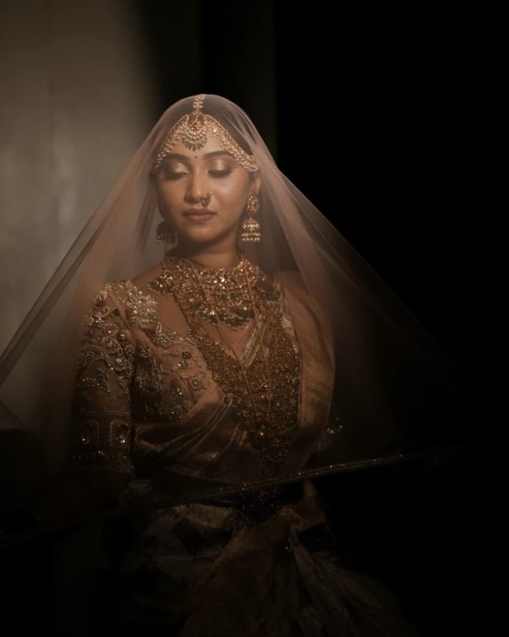 A close-up shot focusing on the bride’s facial features, jewelry, and intricate bridal makeup. A soft smile or a dreamy gaze can make this shot truly mesmerizing.