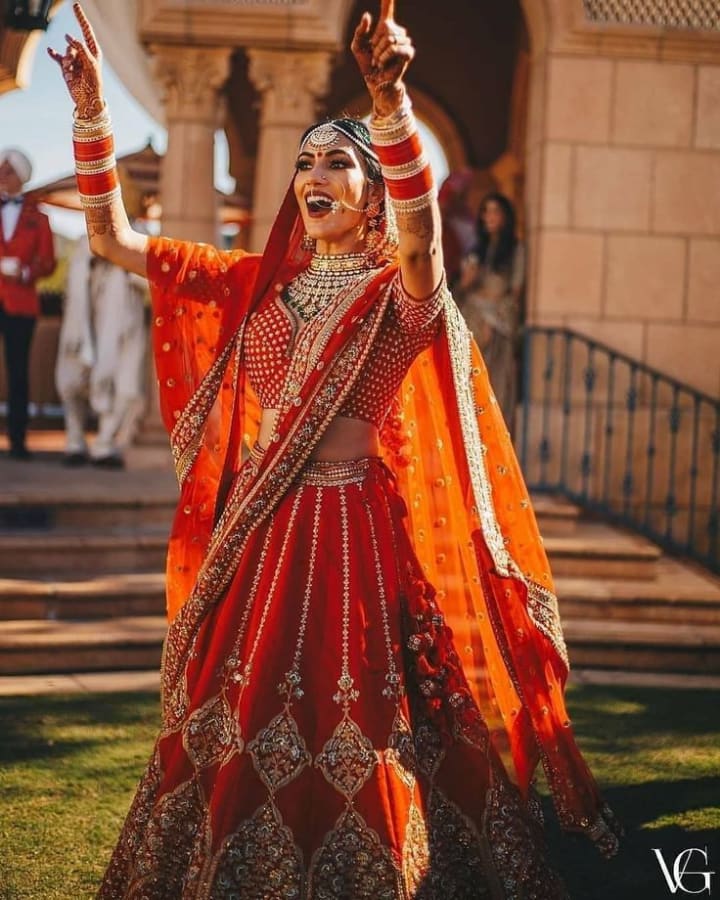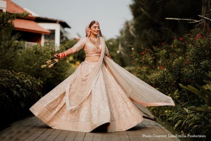 Every bride wants to show off her gorgeous lehenga, and what better way than a twirl? This pose captures the elegance and grandeur of the bridal outfit in motion.