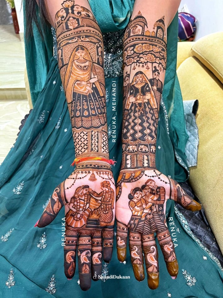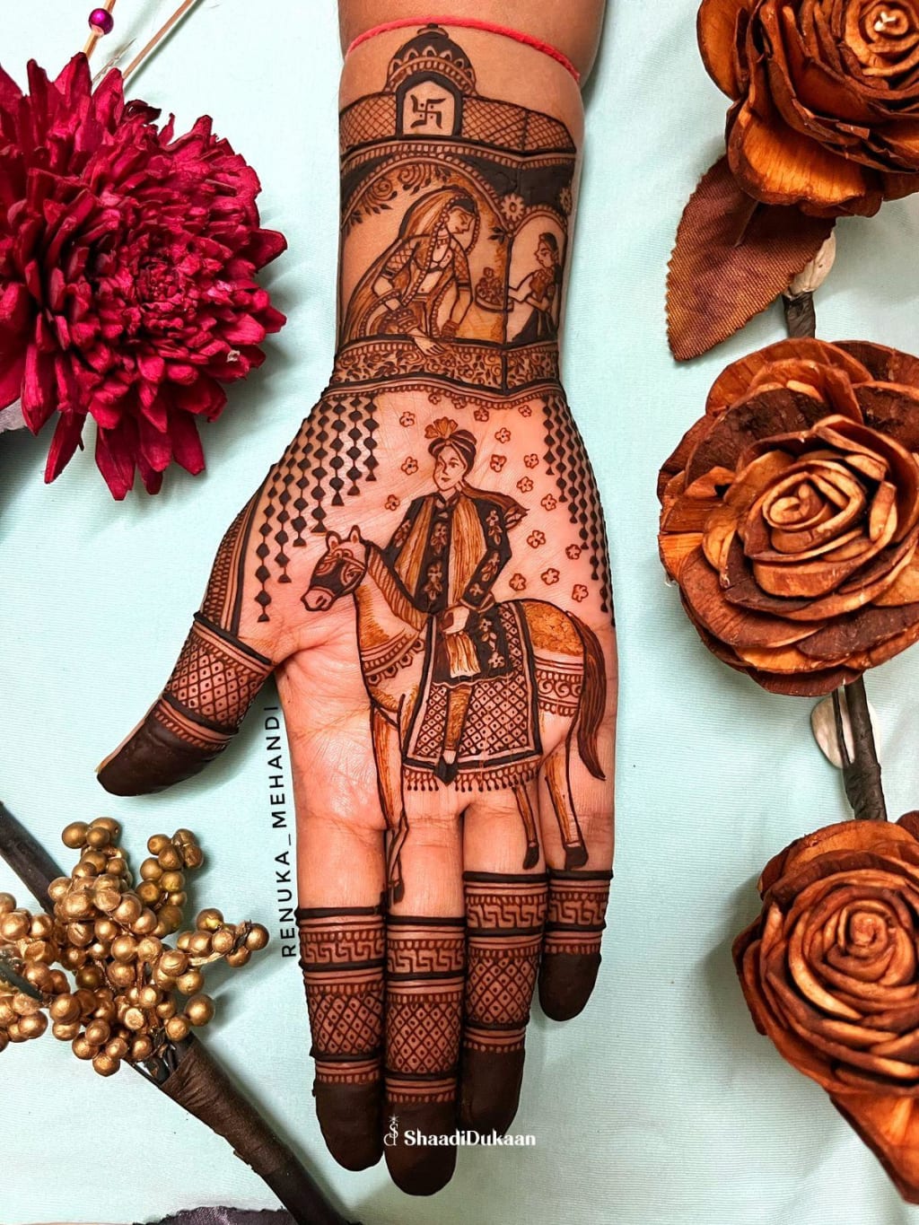 Portrait Mehndi: Personalized designs featuring the couple’s initials, wedding date, or even miniature portraits.