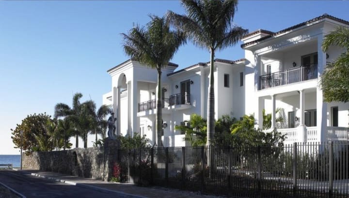 The luxurious mansion has grounds that include three fountains, room for two 60-foot yachts to dock, 6 bedrooms, and 8.5 bathrooms.