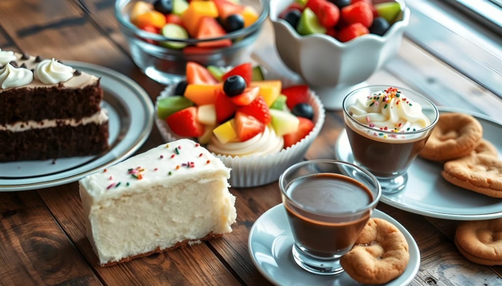 A rainbow of easy homemade desserts -- chocolate cake with frosting, fruit salad, vanilla cupcakes with sprinkles, chocolate mousse, cookies -- all laid out on a wooden table with soft natural lighting.