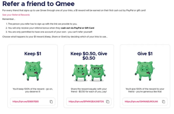 Affiliate program: Qmee has a referral option where you can profit $1 just by someone downloading the app and cashing out $1 using your link. You also have the option to split that dollar with the person who uses your link or give that dollar to them.