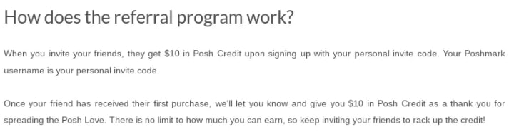 Affiliate program: Send a posh code to one of your family members or friends and they will earn $10 in Posh credit when they make their first purchase of at least $5 and their order is delivered.