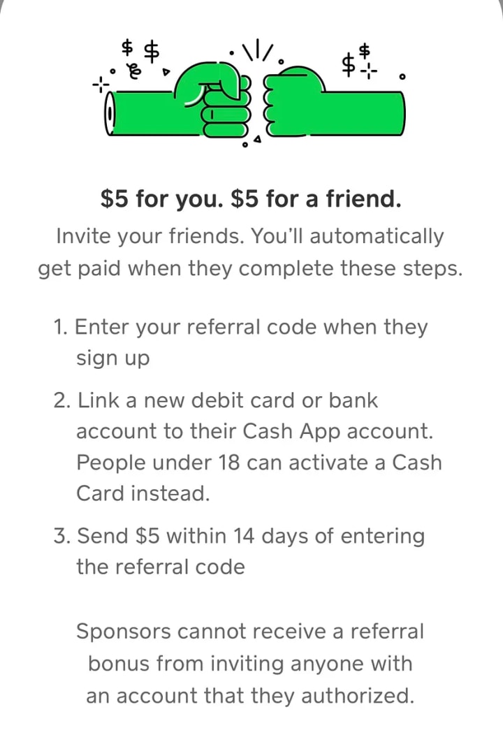 Affiliate program: Cash App will give you $5 to you and $5 to a friend when someone uses your referral code. They just need to link a new debit or bank account and Send $5 to someone within 14 days of entering the referral code.