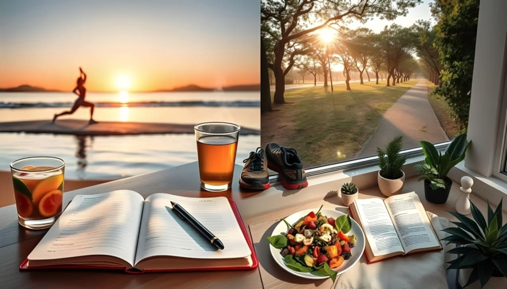 A serene morning scene depicting a diverse collection of daily wellness habits: a person practicing yoga on a calm beach at sunrise, a fresh fruit smoothie in a glass with vibrant colors, a journal open with a pen resting beside it, herbal tea steaming gently on a table, running shoes by a park path lined with trees, a plate of colorful salad beautifully arranged, and a cozy reading nook with soft lighting and plants surrounding it.