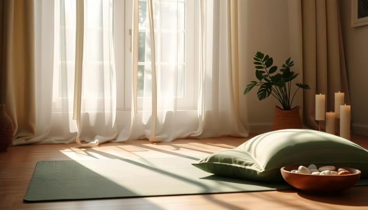 A serene morning scene in a sunlit room, featuring a meditation cushion and a small indoor plant, soft natural light streaming through sheer curtains, a yoga mat rolled out on the floor, gentle colors of green and pastel, peaceful atmosphere with calming elements like candles and a bowl of stones.