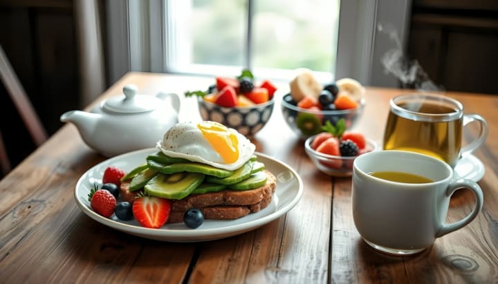 A vibrant breakfast spread on a rustic wooden table, featuring a perfectly stacked whole grain avocado toast topped with a poached egg, alongside a colorful fruit bowl with fresh berries, sliced bananas, and kiwi, a small dish of honey, and a steaming cup of green tea, all set against soft morning light streaming through a nearby window.