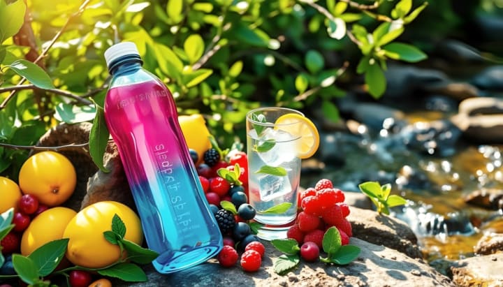 A vibrant water bottle in a serene outdoor setting, surrounded by fresh fruits like lemons and berries, a glass of water with ice and mint leaves, a gentle stream flowing nearby, sunlight filtering through green leaves, emphasizing freshness and vitality.