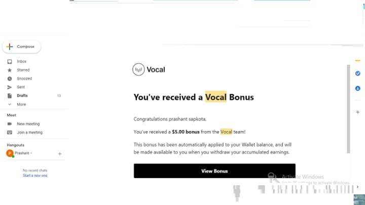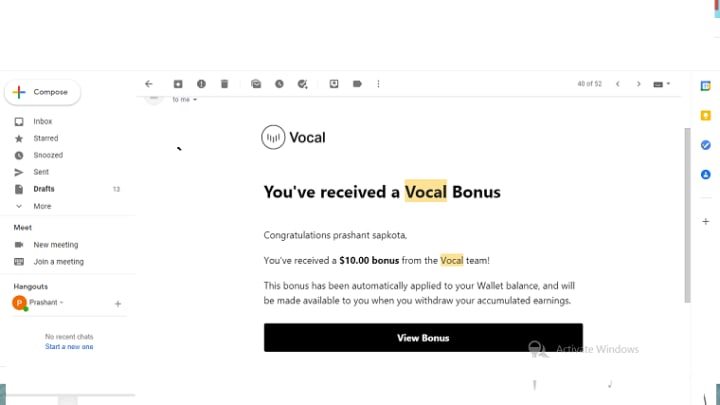 And it was like the morning time when I checked my mail and there was a mail from Vocal team, a bonus.. its like dude this is one totally freaking me out..... wow wow wow.. this time it's $10 couldn't believe at the moment. I was totally speechless at the moment cause $10 is the huge man I have just published over 10+ articles and do have earned $15 wow this is really insane from Vocal.