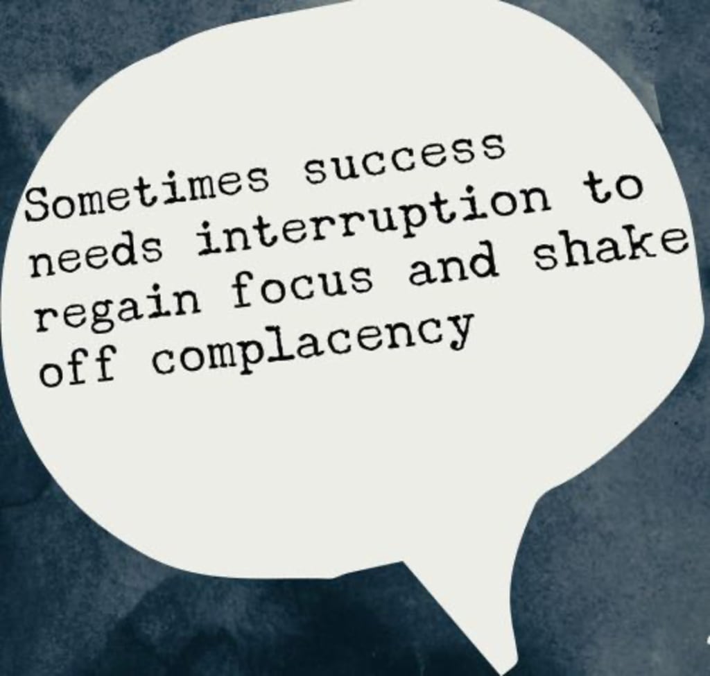 Complacency, when being comfortable become treacherous. Often times in our thinking, careers, behaviors, relationships, health etc… we may get to comfortable with our daily routine or habits.