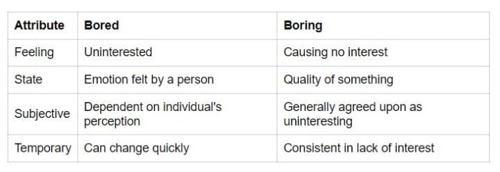“Bored” is an adjective that describes a feeling of weariness or dissatisfaction due to lack of interest, while “boring” is an adjective that describes something that causes boredom or lacks interest.