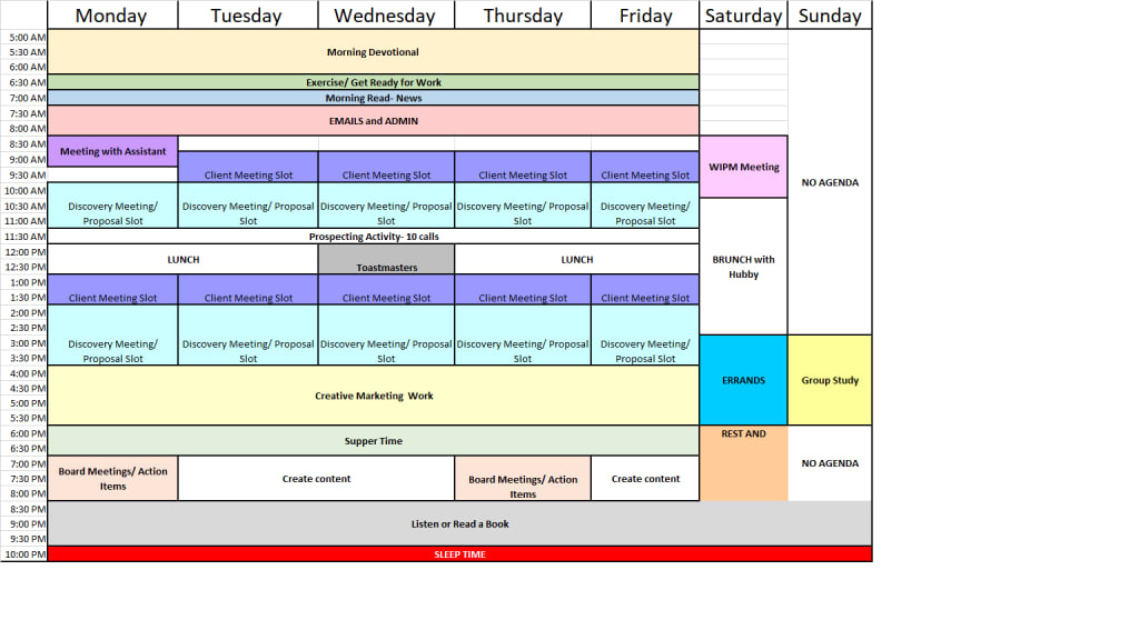 My activities should be mapped out for the day, with time blocks and should be reviewed the night before.