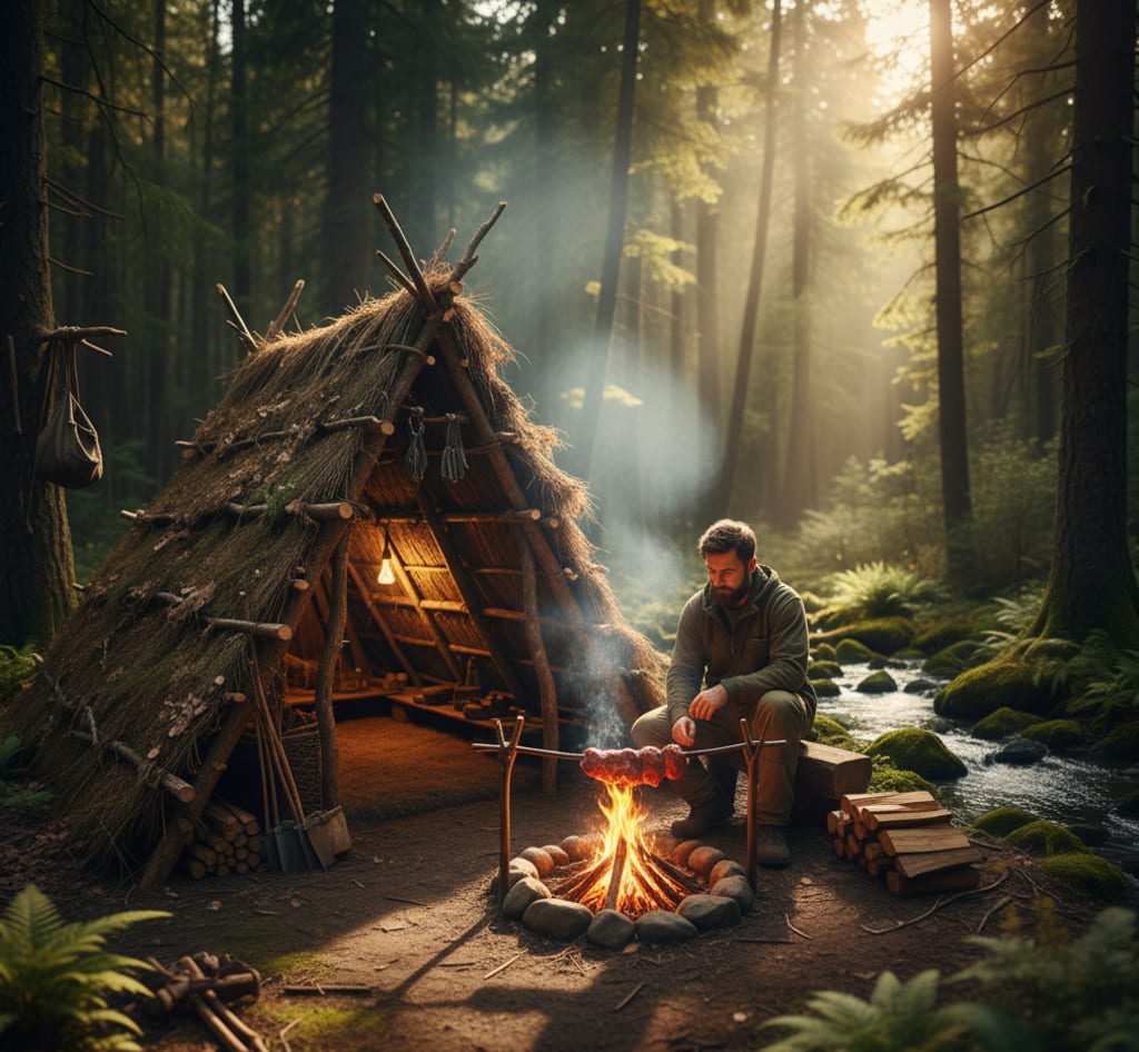 The final step is organizing the entire area. The shelter’s strength, the safety of the fire zone, the storage of dry firewood, food protection from animals, and resting space are carefully checked. Emergency tools, water containers, and basic survival supplies are placed within easy reach. Once everything is in order, the wooden survival shelter in the forest is complete—becoming a place of safety, warmth, and peace, surrounded by true wilderness.