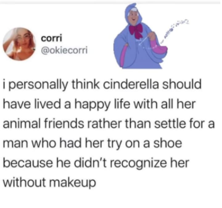If you’re looking at the self-promotion side of the equation, Cinderella gets a solid A+ for delivering on potential. Humility? Maybe not so much. Perhaps, to Corrie’s point, the Prince couldn’t find her again without makeup because he only saw the self-promotion version of her. If he’d had more time to get to know the person, as he does in the most recent version of the story, he’d have a clearer idea about who she was.