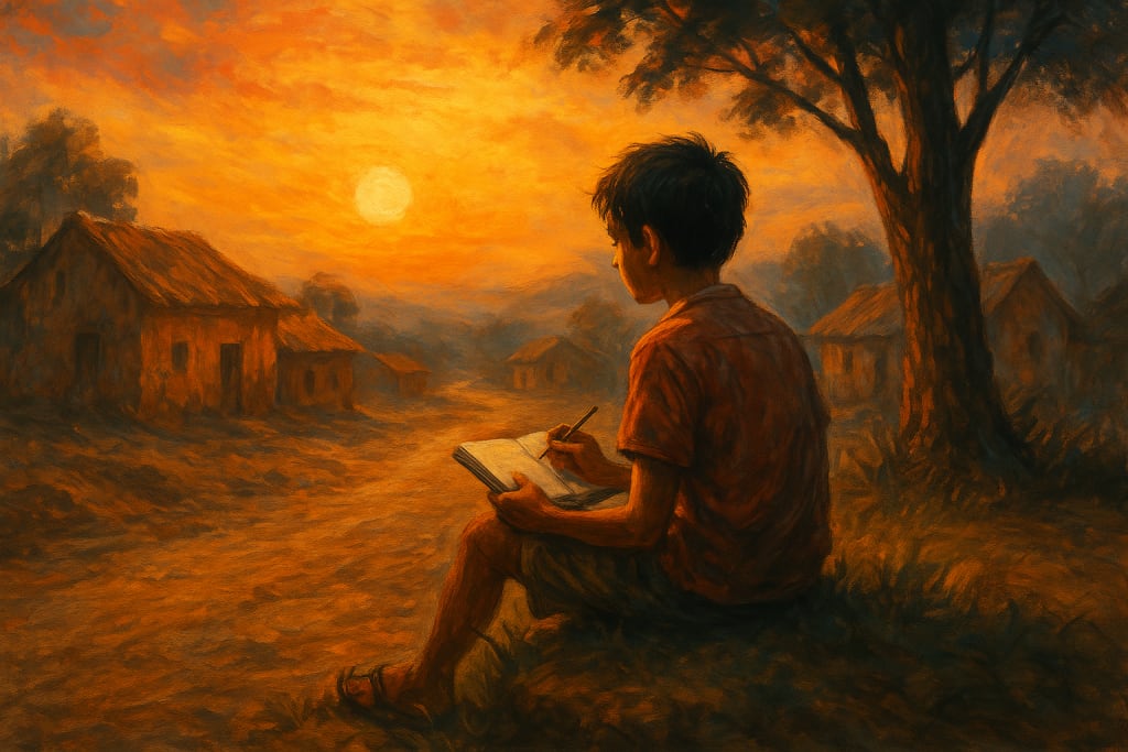 Every evening, Faaiz would climb a small hill that overlooked the edge of his world. He would carry only two things: a pencil so short it needed to be held like a secret, and a notebook whose pages were crinkled with hope. There, with nothing but the sky above and silence all around, he wrote.