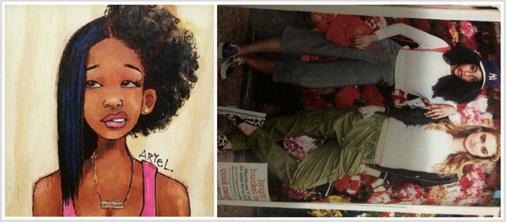 I used to eat lunch at a table of other black girls but one day, on my way to the table, almost everyone pilled up their backpacks in my seat as a subtle message- “you’re not allowed to sit here”. They didn’t say anything, I didn’t say anything. They just stared at me with smirks so as to say- this isn’t your seat anymore. I guess I was uncool. Too uncool to be close to. Too uncool to sit near, so I started eating in the library. Occasionally I would read Seventeen magazine and see some girls with hair that looked like mine. Gosh it would make me feel so happy. However, I found great self confidence in seeing the afros of different girls on tv, in the magazines, and at the stores blown up on big photos. How majestic. Anywhere I saw a girl with hair like me, I felt so seen. Beautiful. Recognized. I remember feeling like I would love to model someday, showcasing beautiful afro hair and representing the girls. 7 years later I did just that. In that same Seventeen Magazine. In 4 different editions. There I was with a big ol' 'fro, just to let the girlies know: we are beautiful.