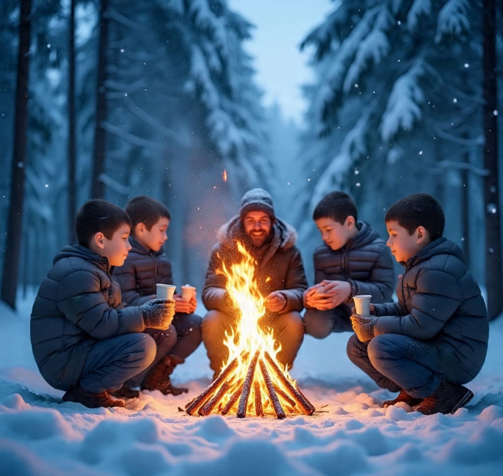 The forest was wrapped in a thick blanket of snow, every branch glistening with frost under the pale blue light of a winter evening. The air was crisp, the kind that nipped at your nose and painted your breath white. In the heart of that serene silence, a small fire crackled brightly—its flames dancing like golden ribbons in the cold air. Around it sat a man and four boys, bundled in thick jackets, their cheeks flushed pink from the chill.