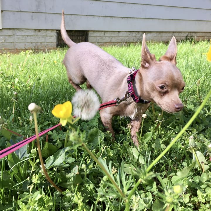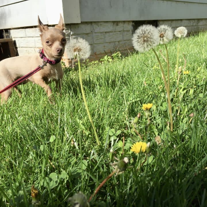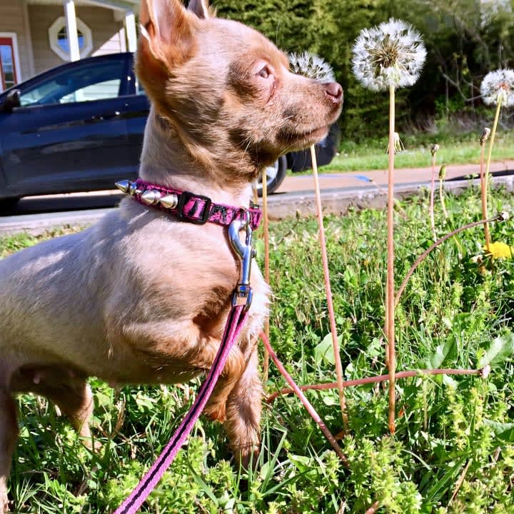 As we strolled along (me still half-asleep, if I’m being honest—mornings aren’t my strong suit), Princess suddenly stopped. She tilted her head and cautiously approached a patch of dandelions, taller than she was, looking utterly perplexed.