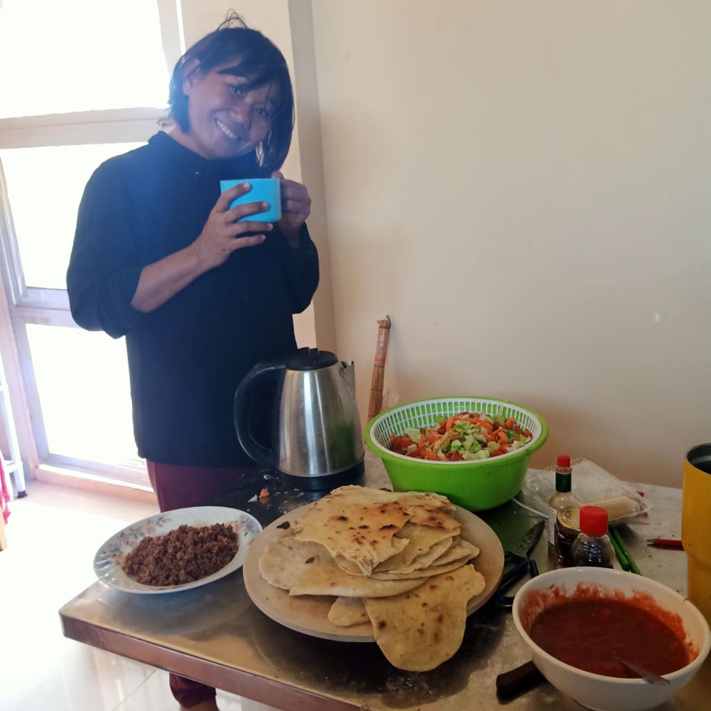 Today, we made homemade pork tacos. The tortillas, sauce, seasonings and veggies are all homemade. The taco seasoning is a mix of dried veggies and spices. The pork comes from a neighbor who has wild pigs (tastes like wild boar). Pigs tend to be quite the work to keep and feed, so unsure if we will have our own or not. The flour is organically grown and delicious in creating our daily bread concoctions. We have some solar capabilities, but should get more if we choose to have anything refrigerated for periods of time. However, a 15 Liter, 12 volt car refrigerator works great and keeps everything just fine for now, so typically, we just eat what we make and leftovers goes to the dog (Kha-Muy) and his friend.